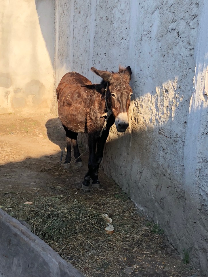 Utanför kyrkan stod denna åsna upptryckt mot en vitkalkad vägg och såg lite smått skrämd ut.