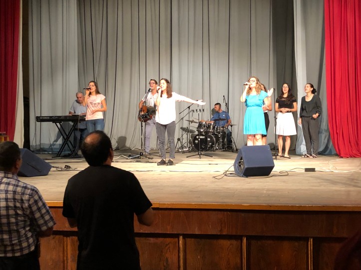 Söndag förmiddag kl. 10 besökte vi en gudstjänst i en pingstförsamling i Plovdiv. Församlingen håller på att bygga en kyrka som ska bli klar till jul. Under byggtiden hyr de in sig i en teatersalong för sina gudstjänster. Lovsången leddes av detta team.