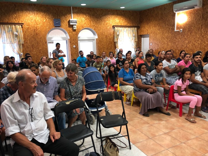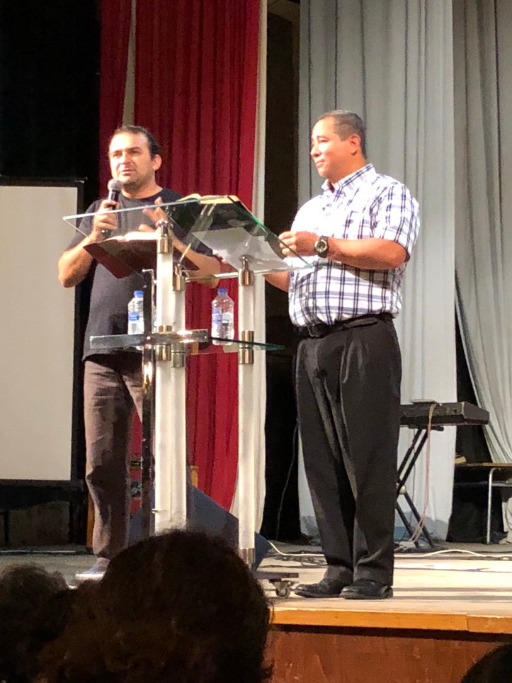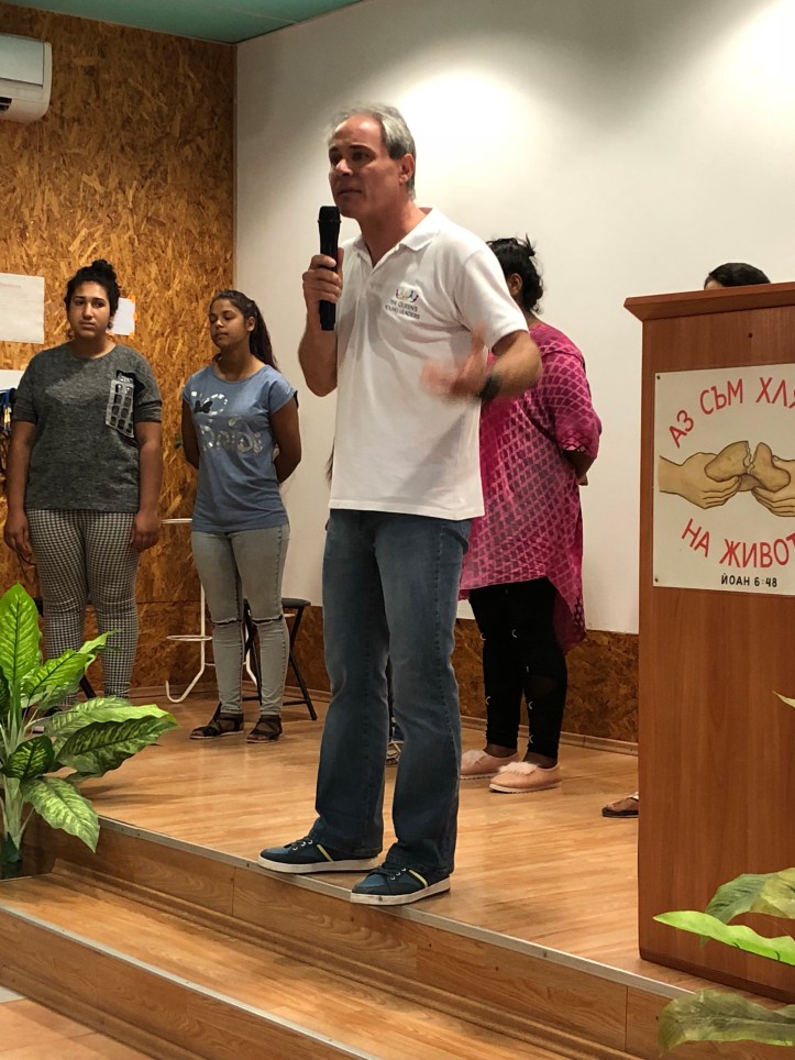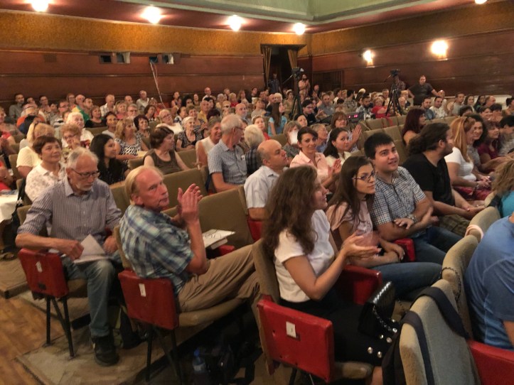 Som du ser på bilden var teatersalongen fullsatt. Gudstjänstbesökarna fick lyssna till predikan av en pastor från El Salvador. Lars-Inge fick också möjlighet att informera om ”Bulgarien i Folus” och vår grupp sjöng ” O, store Gud” på svenska.