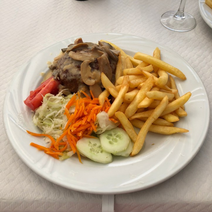 En 300 g köttbulle med svampsås och diverse övriga tillbehör som synes. Det var jättegott.