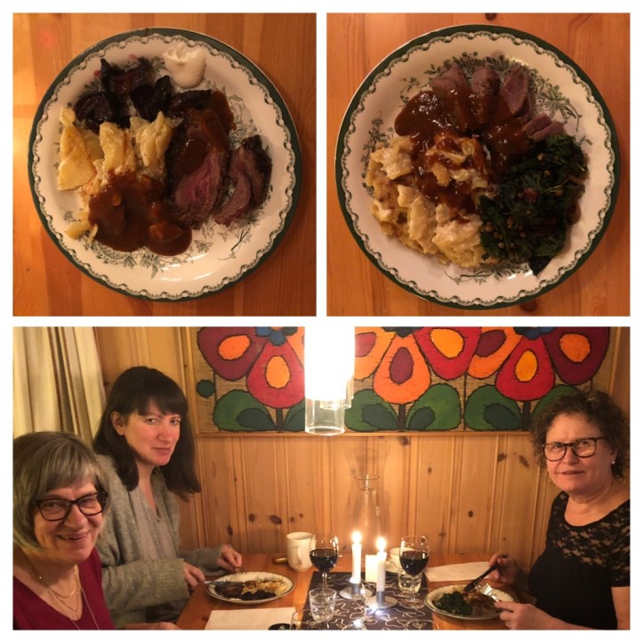Väl installerade i stugan var det dags att inta kvällens middag. Enligt traditionen bjöd Ewa på potatisgratäng med kassler. Det smakade jättebra. Precis som vi därefter fått igång TV:n, hörde vi hur det bankade på ytterdörren. Det var våra grannar som inte lyckats få sin TV att fungera. Vi förklarade hur vi gjort och de fick låna en skriftlig instruktion som fanns till vår TV men det lyckades inte ändå. De skulle höra av sig till stugägaren dagen därpå. Vi som kunde se på TV, tillbringade några timmar i TV-soffan innan det var dags att inta ryggläge.
