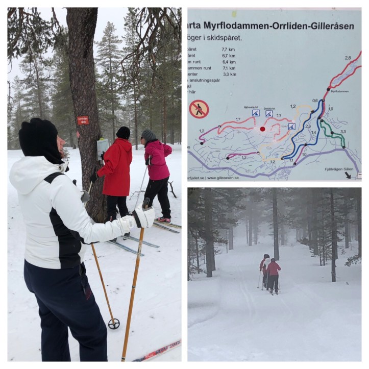 Tisdagen bjöd på något bättre väder men ändå inte helt klart. Det fick bli längdåkning denna dag. Vi kunde kliva på ett spår inte långt från vår stuga. Efter några hundra meter kom vi fram till en spårkarta som uppvisade en mängd olika spåralternativ. Vi valde ett av de kortare – man ville ju inte förta sig.