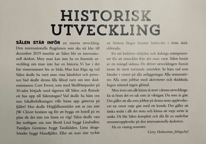 Den övergripande utvecklingen och framtidsoptimismen som bygger på en historisk utveckling i Sälenfjällen beskrivs bra i en ledarartikel i tidningen ”Sälenmagasinet”:
