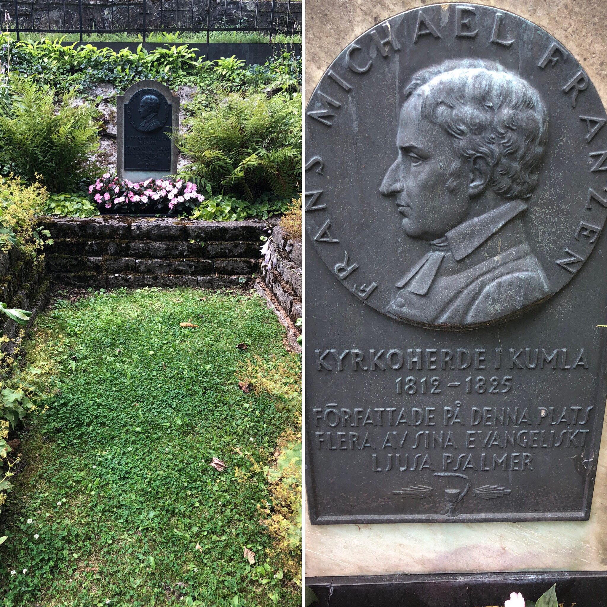 Kopplingen till Kumla då. Den hade jag faktiskt något bättre koll på. Jag visste att Franzén hade varit kyrkoherde i Kumla men inte vilken tidsperiod det var. Jag hade också hört att han under sin tid i Kumla skrev bl.a. de ovannämnda psalmerna, troligen i en krypta i närhet av Kumla kyrka. Väl hemma i Kumla igen åkte jag upp till kyrkan och letade upp kryptan och tog bilderna nedan. Jag gillar texten på minnesstenen om att han på denna plats författade flera av sina ”evangeliskt ljusa psalmer”.