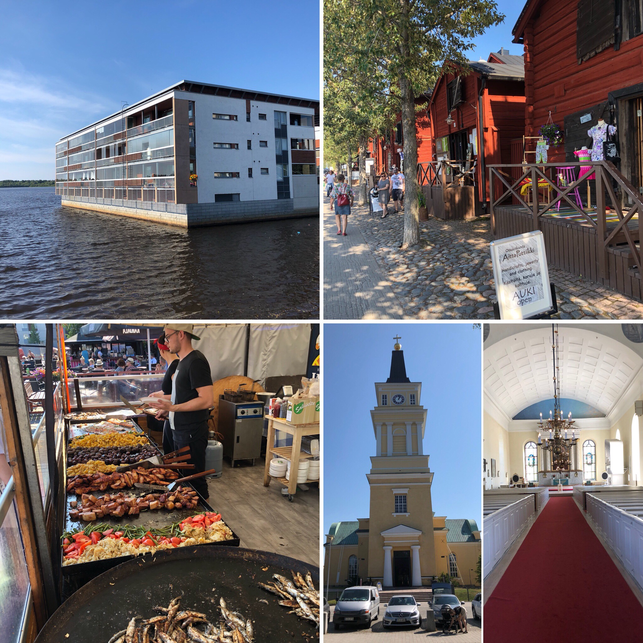 Andra dagens eftermiddag tog min fru och jag några timmars stads- och shoppingpromenad i centrala Uleåborg. Nere vid hamnen har man byggt några lägenhetshus en bit ut i vattnet. Det går att angöra sin fritidsbåt vid en liten kaj och gå direkt upp till sin lägenhet. Inte så illa. På land mitt emot låg några röda små träbyggnader som inrymmer olika affärer och något café. Det såg riktigt mysigt ut. På hamntorget var det marknad med utbud av olika slag. Trots att vi ganska nyss ätit lunch kunde vi inte motstå frestelsen att dela en portion stekt småfisk med vitlökspotatis och en god röra till. Vi besökte också den vackra domkyrkan.
