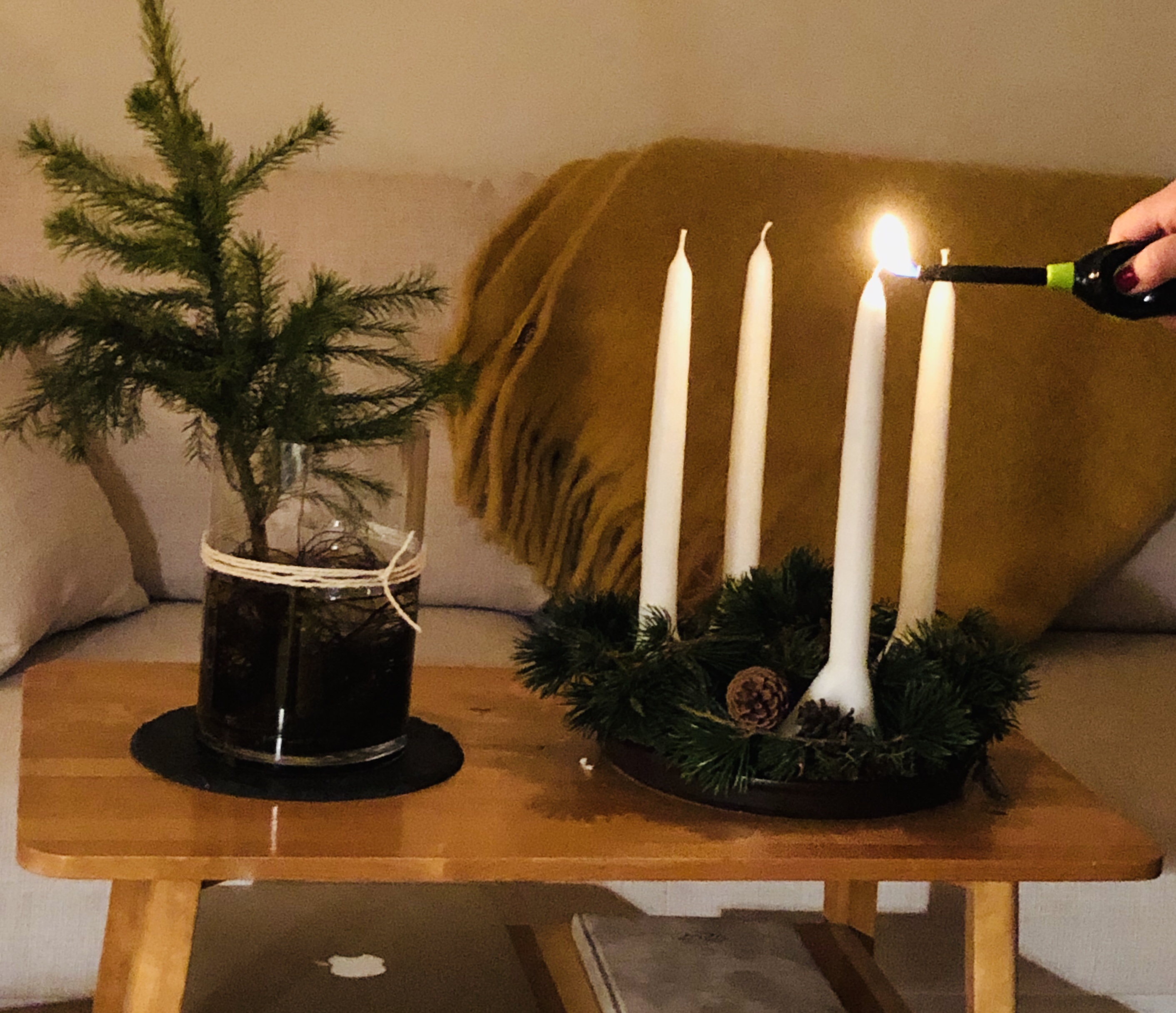 I dag har vi tänt det första ljuset i adventsljusstaken. Ja, vi har ju förstås flera olika sådana stakar. Men i år har vi en alldeles speciell. Ett adventsljus skulle jag säga eftersom det är stöpt i ett stycke. Det är A-C som har gjort det. Nu har hon också tänt det.