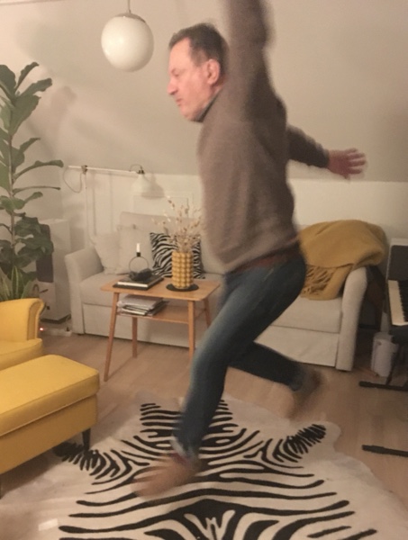 Du kanske kommer ihåg Stina Dabrowskis intervjuprogram i SVT där hon i slutet av varje program utmanade sitt intervjuoffer att, som symbol för hoppet i tillvaron, genomföra ett hopp upp från golvet. De flesta antog utmaningen, några gjorde det inte och en del fick hon hålla i handen för att de skulle våga. Här på bilden försöker jag mig på ett hopp. Hopp kan alltså handla om rörelse eller att ta ett språng.