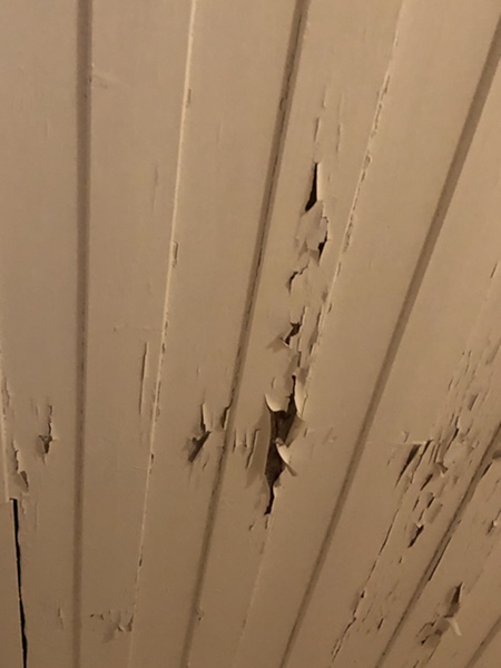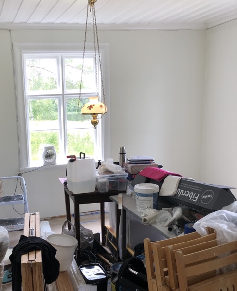Det första vi såg när vi gick in i stugan var det nya trägolvet och den nya takpanelen i hallen som vår hantverkare hjälpt oss med tidigare på våren. Det blev riktigt bra, tyckte vi. När vi sedan gick in i rummet möttes vi av en tråkig överraskning. Golvet var fullt av vita färgflagor som fallit från taket. Vi hade tydligen använt en färgsort som inte alls matchade med den befintliga, när vi målade taket förra hösten. Så när det gällde takmålningen var vi tillbaka på ruta ett och det kändes som ett riktigt antiklimax. Rådet vi fick av vår hantverkare var att använda färg för utomhusbruk för bättre vidhäftning. Så gjorde vi och färgen sitter fortfarande kvar.