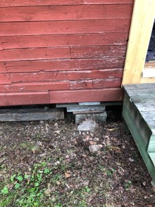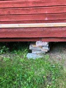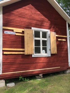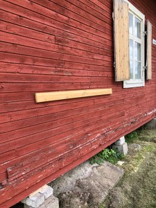 Dagen därpå, efter en god frukost, for vi ut till kyrkstugan. När vi kom dit såg vi att vår hantverkare hade spikat på brädor på de ställen där den befintliga panelen var som sämst. Det innebar att där sipprade sågspånet ut mellan stora springor. För oss blev det då så klart och tydligt att vi behövde göra något åt fasaden. Hur och vad det skulle bli var vi inte riktigt klara över än. Det enda vi i nuläget gjorde var att måla rödfärg på de påspikade brädorna så att det inte skulle lysa så iögonfallande.
