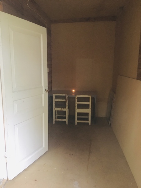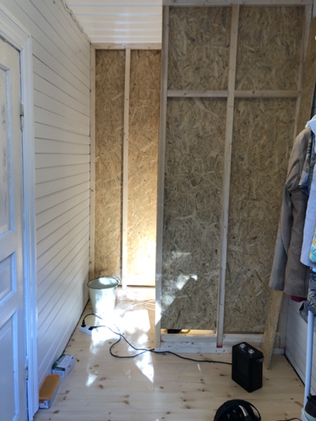 Därför satte vi upp två mellanväggar lite omlott så att de bildade en sluss från halldelen in till det mer privata utrymmet. Det var första gången i mitt liv som jag var inblandad i något dylikt snickeri. När väggarna var klara satte vi underlagstapet och målade vitt.