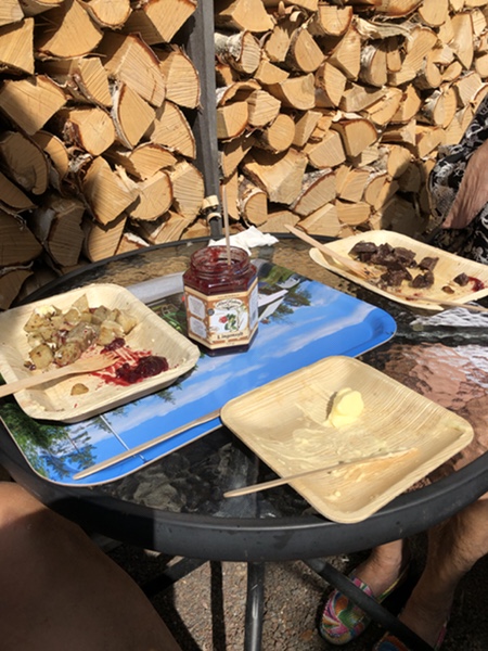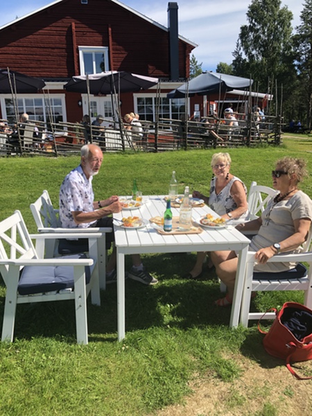 Vi har lunchat på lite olika platser i närområdet. En dag besökte vi Alterhedens gårdsbutik, där vi, förutom att göra en del inköp, även åt pitepalt. Några dagar senare blev Jössgården i Sjulsmark vårt lunchställe. En god sommartallrik i en härlig gammal anrik miljö med anor från 1500-talet. Sjulsmark är en by som min fru, från sin uppväxt i Luleå, har en tydlig koppling till. Där bodde hennes morbror och moster, Mårten och Irene Öhman med sina fyra döttrar, alltså Ann-Catrines kusiner. Hon var jämnårig med en av dem och de var mycket tillsammans under uppväxtåren, Moster Irene och två av kusinerna besökte oss i stugan denna sommar.