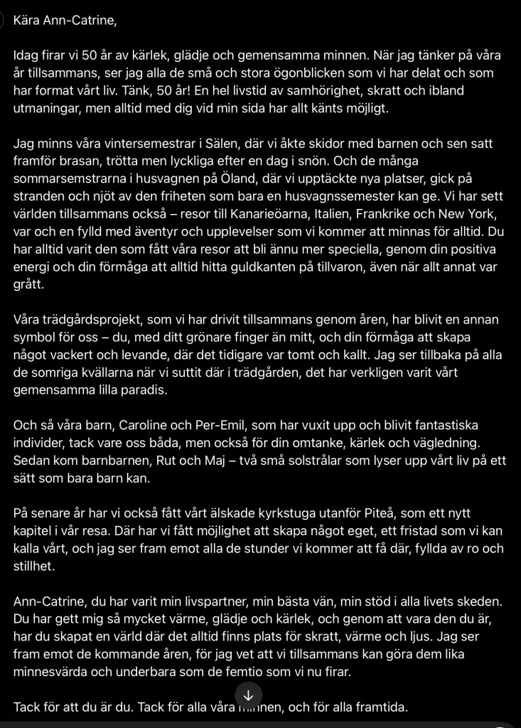*** När jag lyssnade på Tomas Sjödin i programmet Vinter i P1 dagen efter vårt firande, berättade han bl.a. om en liknande upplevelse, som den jag var med om. Att jag började gråta och skratta när jag läste det AI-genererade guldbröllopstalet till min fru. I Sjödins fall hade det dock inte med AI att göra. Men det handlade om att han skulle läsa upp en text som en annan person hade skrivit och, som det visade sig, var en sammanfattning av det liv Tomas ditintills levt. Har du inte lyssnat på programmet, gör gärna det. Om du klickar på länken längst ner kommer du direkt till programmet, som tar ca en timme att lyssna på. Men det är värt varenda minut. En mycket stark berättelse och så långt från AI du kan komma.